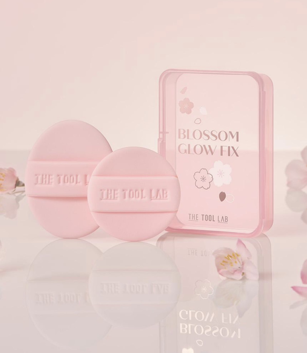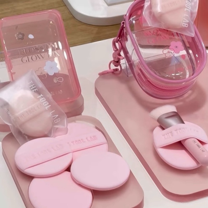 櫻花粉橢圓粉撲 2 入、圓形粉撲 2 入、迷你清潔皂、收納盒